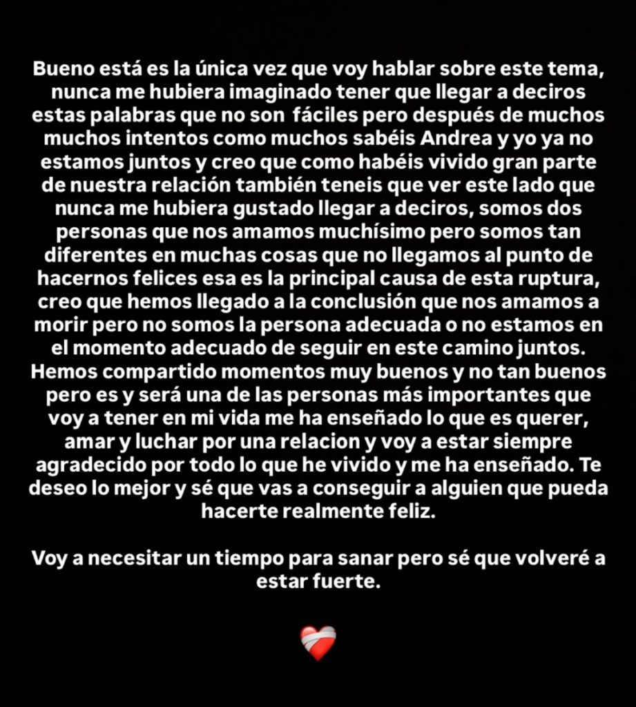 El 4 de agosto, Joel sorprendió a sus seguidores con un texto en su cuenta de Instagram, donde confirmaba el final de la relación. Con tono calmado, aseguraba que ambos se quieren mucho pero que no consiguen hacerse felices. Todo muy correcto. Muy educado. Muy neutro. Pero, al parecer, Andrea no sabía ni que lo iba a publicar.