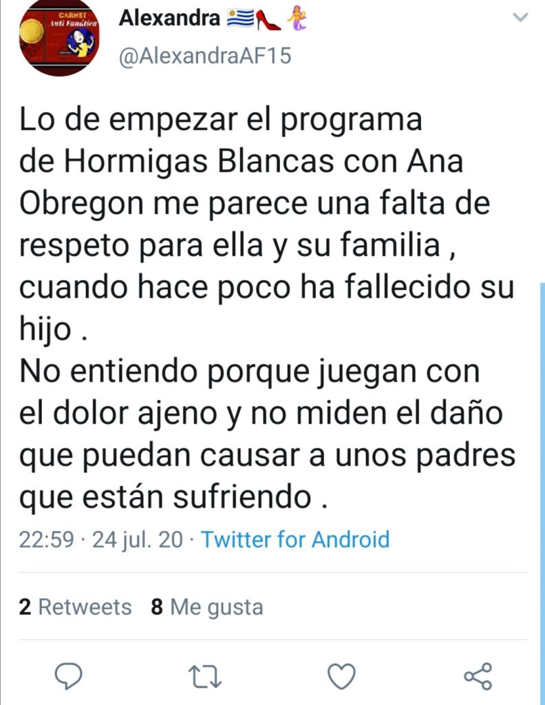 Recordemos que Ana Obregón ha perdido recientemente a su hijo, Aless Lequio, a causa de un cáncer. Las redes no consideran oportuno la emisión del programa, puesto que el duelo es muy reciente, no siendo el momento de recordar ciertos aspectos de su vida, donde sabemos que estaba muy unida a su hijo, y menos rascar en el pasado de la actriz. Esto es lo que han manifestado las redes: