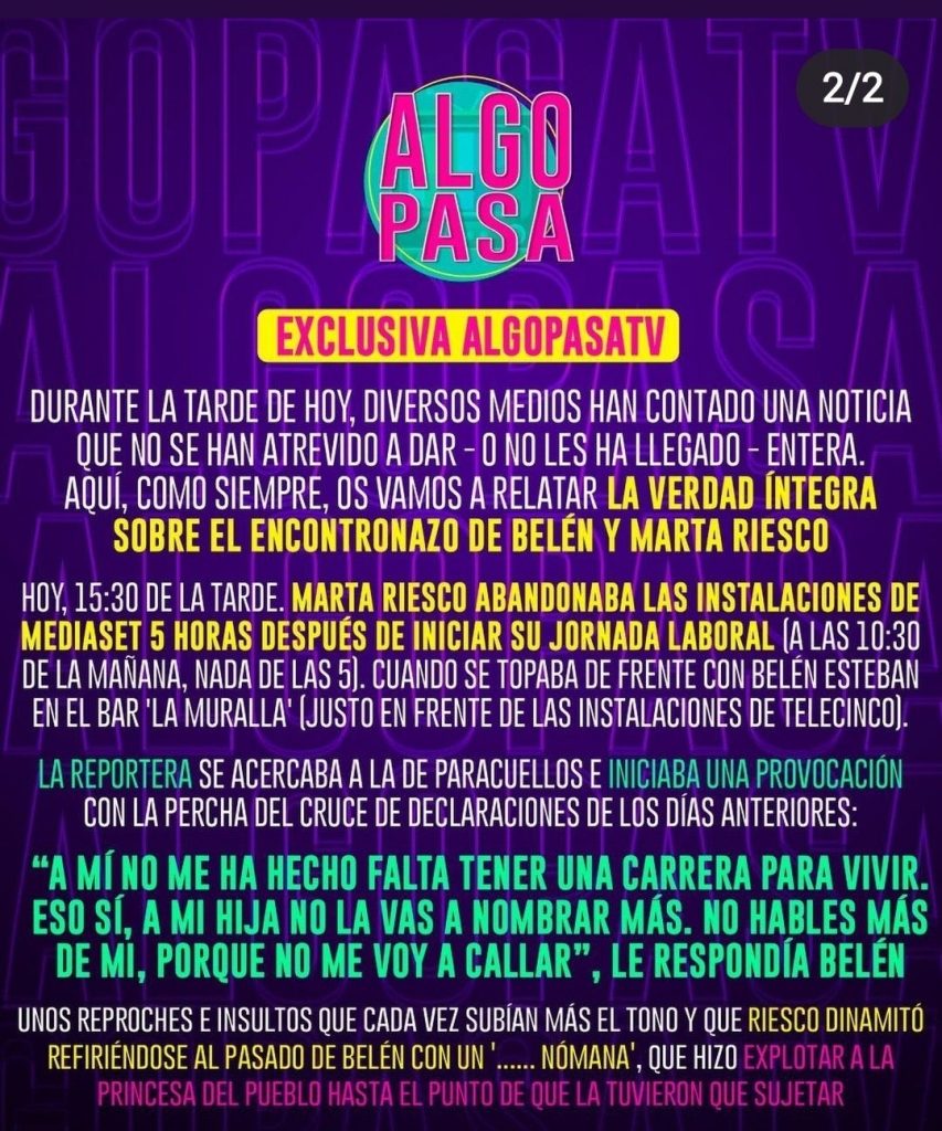Belén Esteban y Marta Riesco se han encontrado fuera de plató y han tenido un comentario rifirafe. Las protagonistas le han quitado hierro al asunto, pero un medio digital ha descrito con más detalle el encontronazo. Léelo a continuación: