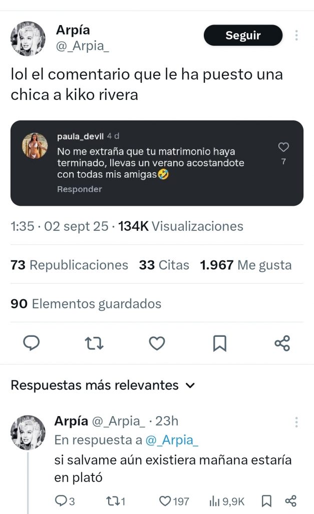 Los usuarios no tardaron en ironizar: “Si Sálvame aún existiera, mañana estaría en plató”, decía @Arpia. Otros fueron más crueles con frases como: “Pues qué mal gusto tienen las amigas”, “Esa busca platós” o “Megaf**lanas”*. La idea general era clara: si estas palabras llegan a los programas del corazón, Kiko Rivera vuelve a estar en la diana mediática.