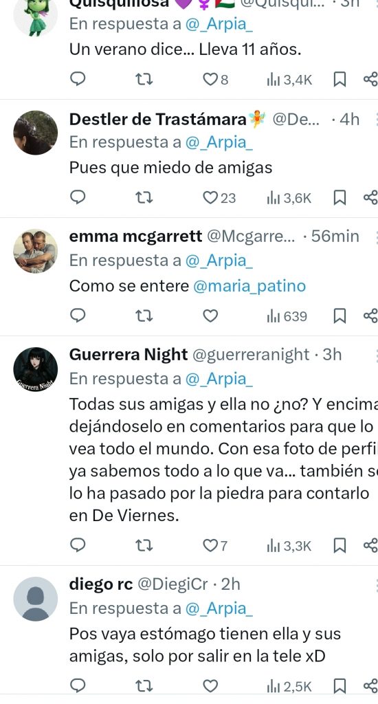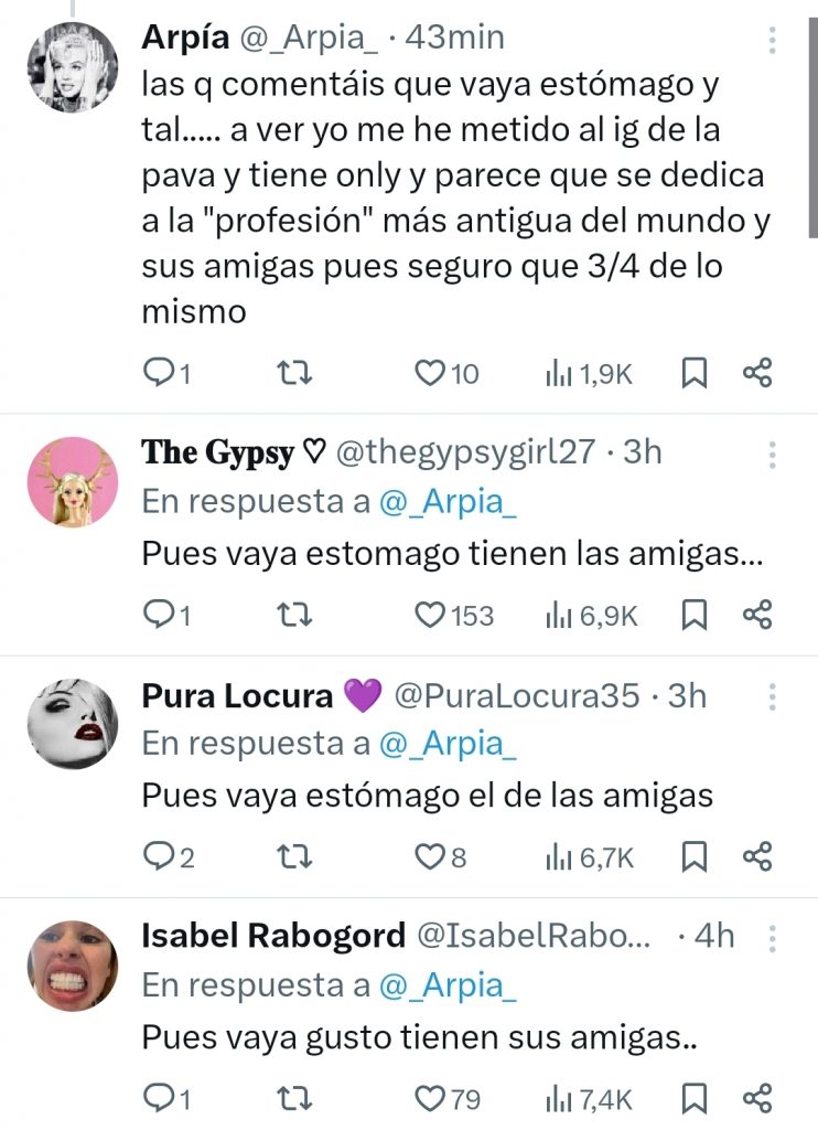 La marea de respuestas no solo cargaba contra Kiko, también contra las supuestas amigas. “Pues vaya estómago tienen”, repetían varios. Otros apuntaban directamente: “Solo por salir en la tele se acuestan con quien sea”.