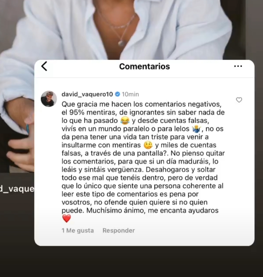 David que ha intentando estos días hacer que le daba igual todo lo que le estaban diciendo, al final reventó porque los comentarios en sus publicaciones se convirtieron en un despropósito. Fue en una de sus publicaciones en las que explotó y se explayó un par de veces de lo lindo en contra de sus haters. Esto es lo que les ha contestado: