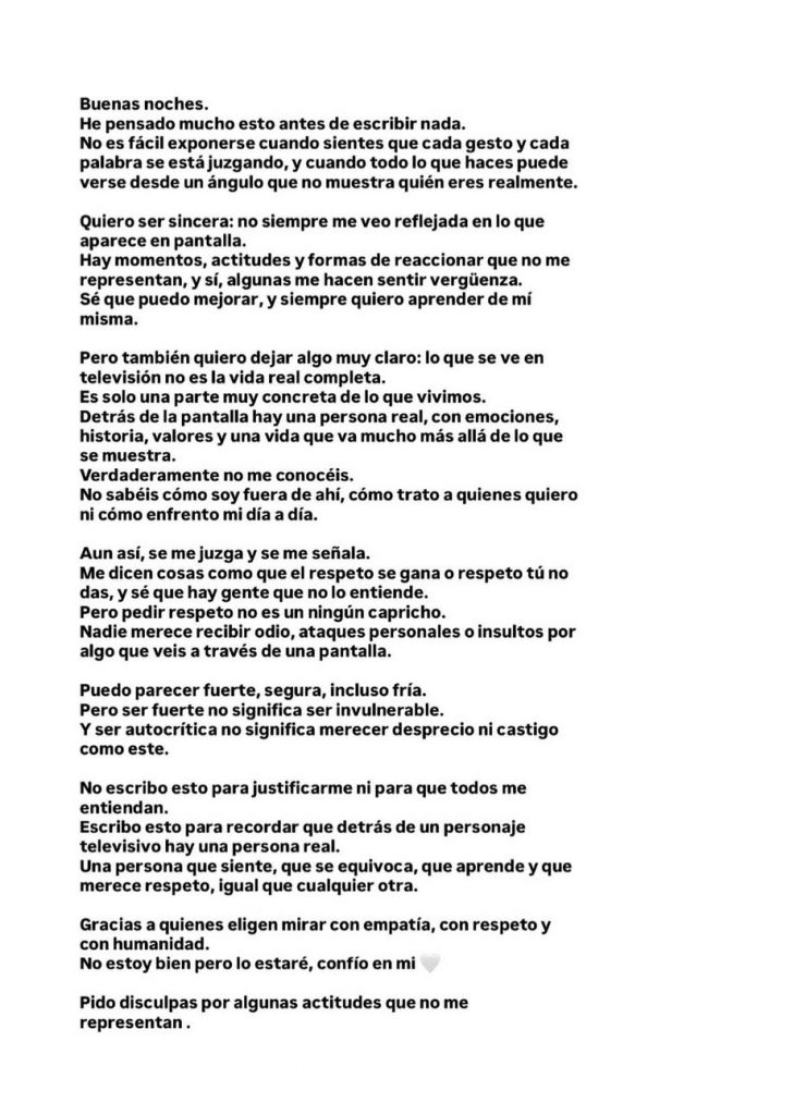 Reconoció que se sentía avergonzada por algunas de sus actitudes, que no se reconocía en ciertos momentos que se habían emitido y que entendía perfectamente que había herido a Almudena.