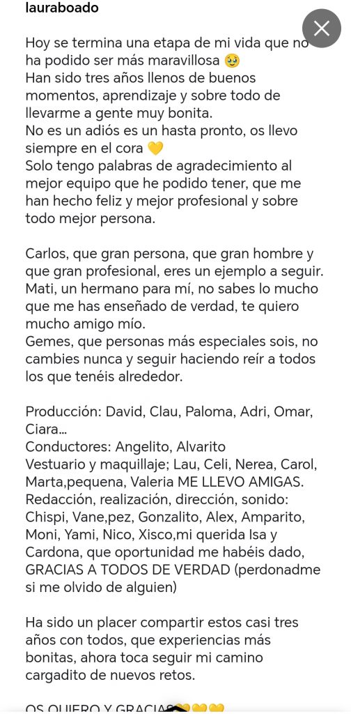 En su despedida, Laura no se olvidó de nadie. “Gracias a todo el equipo de producción, maquillaje y vestuario, y a mis compañeros, que han sido como una familia: Carlos Sobera, Matías, las gemelas Cristina y Marisa…”, enumeraba en sus redes sociales. Con ese gesto, dejaba claro que detrás de las cámaras existe un grupo unido que ha sido fundamental en su camino.