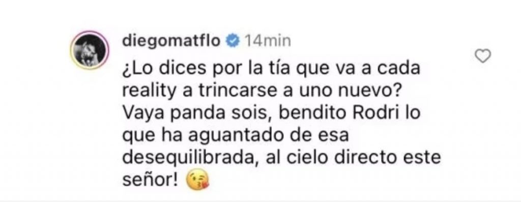 Diego Matamoros se ha convertido en el protagonista de las redes sociales por un hecho algo controvertido. El hijo de Kiko Matamoros ha recibido numerosas críticas a través de las redes sociales por un desafortunado y machista comentario que ha realizado sobre Adara Molinero en post subido por Rodri Fuentes, expareja de la subcampeona de ‘Supervivientes 2023’. (Lee aquí como acusan a Isa P de cometer un grave error que fue el culpable de que Asraf no ganara Supervivientes).