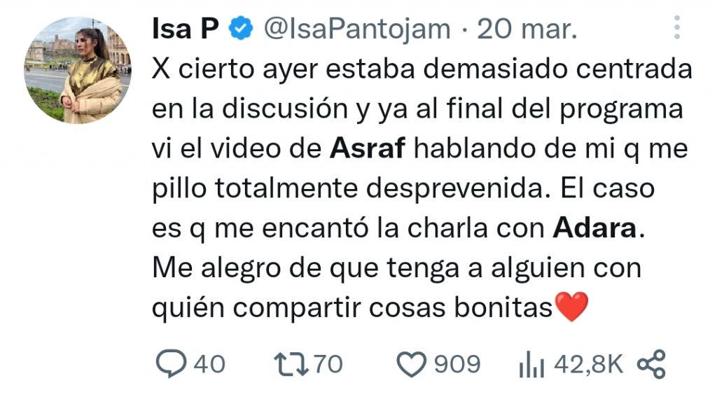 Aitor, el hermano de Adara reacciona desde el plató a esto: «No me extraña que esté así porque tiene un niño adorable«. Y da las gracias a Asraf por su comportamiento con ella. También Isa Pantoja se ha mostrado emocionada ante este momento: «Sé lo que es extrañar a tu hijo siendo muy pequeño y simplemente me emociona«. Además, apunta que Asraf convive con su hijo, «que también le echará de menos y por eso empatiza tanto con ella«, y agradece cómo está siendo Adara con él y cómo se alegró de su salvación en la pasada nominación.