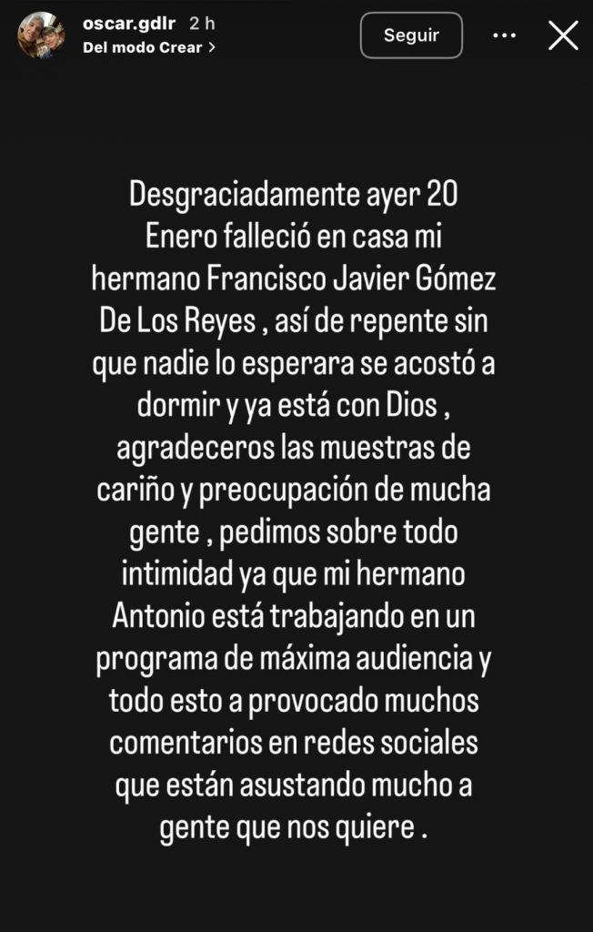 «Desgraciadamente el pasado martes 20 de Enero, falleció en casa mi hermano Francisco Javier Gómez de Los Reyes. Así; de repente, sin que nadie lo esperara se acostó a dormir y ya está con Dios. […] Pedimos, sobre todo, intimidad ya que mi hermano Antonio está trabajando en un programa de máxima audiencia y todo esto ha provocado muchos comentarios fuera de lugar que están asustando a gente que nos quiere. Gracias por el cariño recibido. Vuela alto, peque.»