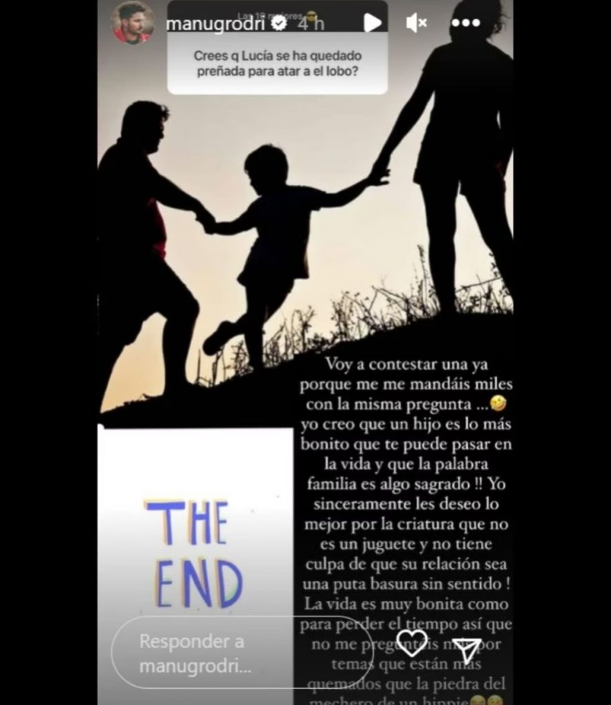Manu ha respondido a la cuestión de un usuario que preguntaba si Lucia se había quedado preñada para atar a Isaac. Su respuesta no ha dejado indiferente a nadie: «Yo creo que un hijo es lo más bonito que te puede pasar en la vida y que la palabra familia es algo sagrado! Yo sinceramente les deseo lo mejor por la criatura, que no es un juguete y que no tiene culpa de que su relación sea una puta basura sin sentido«