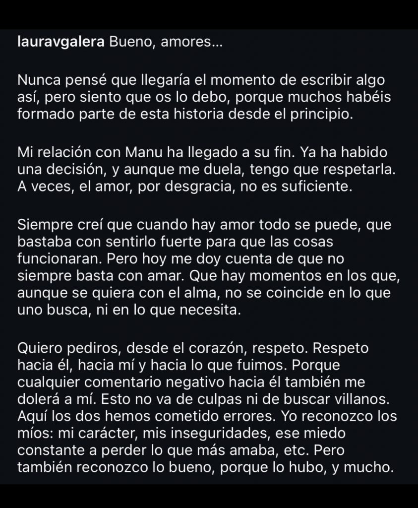 Laura respondió con una carta pública y emotiva en su muro, acompañada de una foto en blanco y negro junto a Manu. En ella reconocía errores compartidos y explicaba que, aunque había amor, no funcionaron porque no coincidían en lo que buscaban y necesitaban. Sus palabras sugieren que fue Manu quien tomó la decisión final.