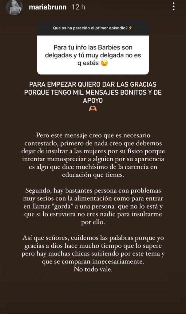 Maria ha publicado un mensaje en Instagram donde se meten con su físico. La tentadora ha contestado con un texto a dicho mensaje para dar visibilidad a estos hechos y concienciar sobre un tema tan delicado. Este es el mensaje: