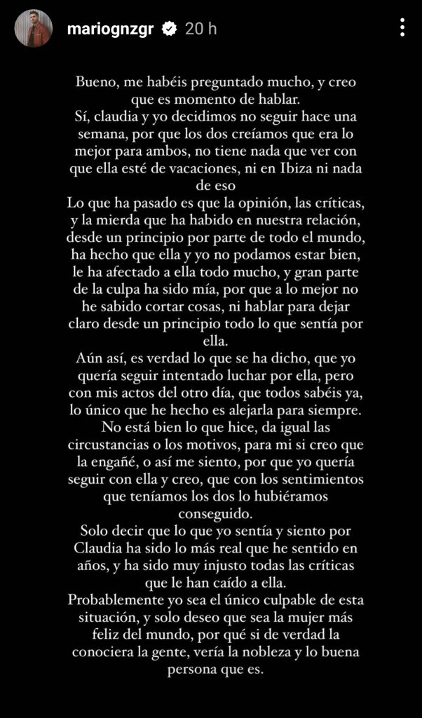 Habrá que esperar para ver cómo termina todo y si, finalmente, Mario y Claudia se reconcilian o si, por lo contrario, ella decide volver a intentar algo con Javi. Lo que está claro es que Javi y ‘Clau’ demostraron en la isla quererse mucho, pero no hacerlo de la forma correcta. Igual el tiempo todo lo cura y vuelve a unirlos. De momento lo que termina de confirmar la separación es esta publicación de Mario: