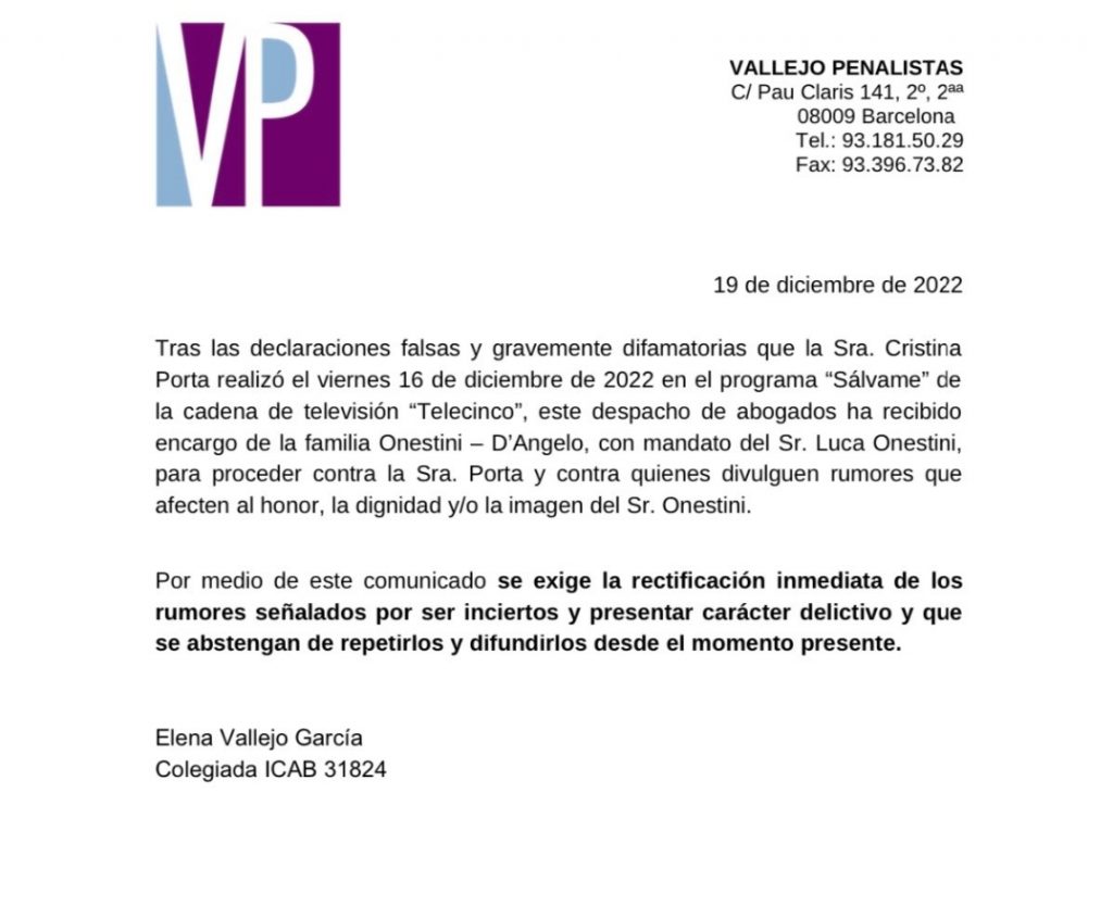 Por todo esto la familia de Luca Onestini no ha tardado en anunciar que demandara a Cristina Porta por las graves acusaciones que está vertiendo sobre él. Este es el comunicado de demanda: