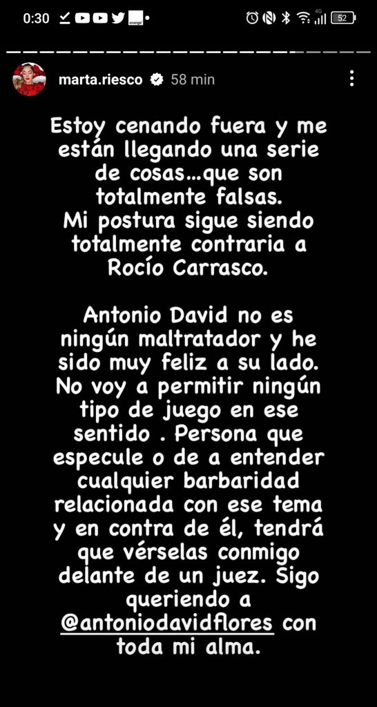 La ruptura entre Marta Riesco y Antonio David Flores ha sorprendido a muchos, entre ellos, a los seguidores de la periodista. Aunque aún existen diversas incógnitas sobre el motivo principal de la ruptura, ella ha querido aclarar un detalle importante y lo ha hecho a través de su perfil en redes. Indica que sigue siendo «contraria a Rocío Carrasco» y subraya que el malagueño no es un «maltratador«. (Pulsa aquí para ver como Rocio Flores rompe su silencio sobre su culpabilidad en la ruptura de su padre y Marta Riesco).