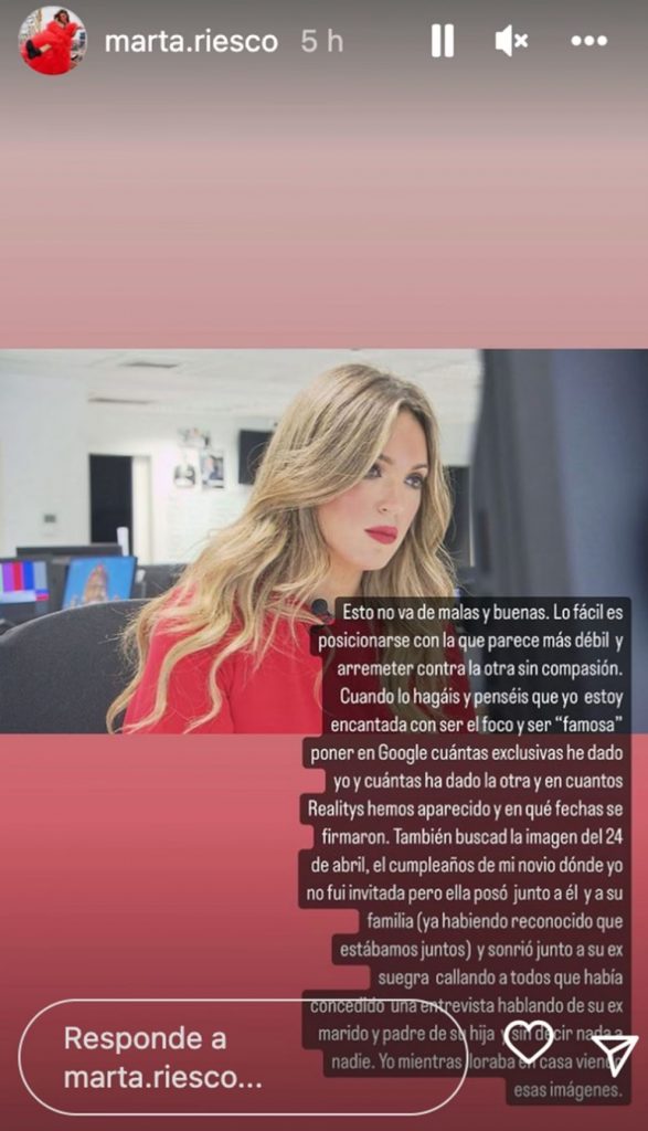 Para poner punto final a la polémica, Riesco ha querido dejar clara su postura: “Esto no va de malas y buenas. Lo fácil es posicionarse con la que parece más débil y arremeter contra la otra sin compasión. Cuando lo hagáis y penséis que yo estoy encantada con ser el foco y ser ‘famosa’, poned en Google cuántas exclusivas he dado yo y cuántas ha dado la otra y en cuántos realitys hemos aparecido y en qué fechas se firmaron. También buscad la imagen del 24 de abril, el cumpleaños de mi novio, donde yo no fui invitada pero ella posó junto a él y su familia (ya habiendo reconocido que estábamos juntos) y sonrió junto a su exsuegra callando a todos que había concedido una entrevista hablando de su ex y padre de su hija, sin decir nada a nadie. Yo mientras lloraba en casa viendo esas imágenes”, zanjaba.