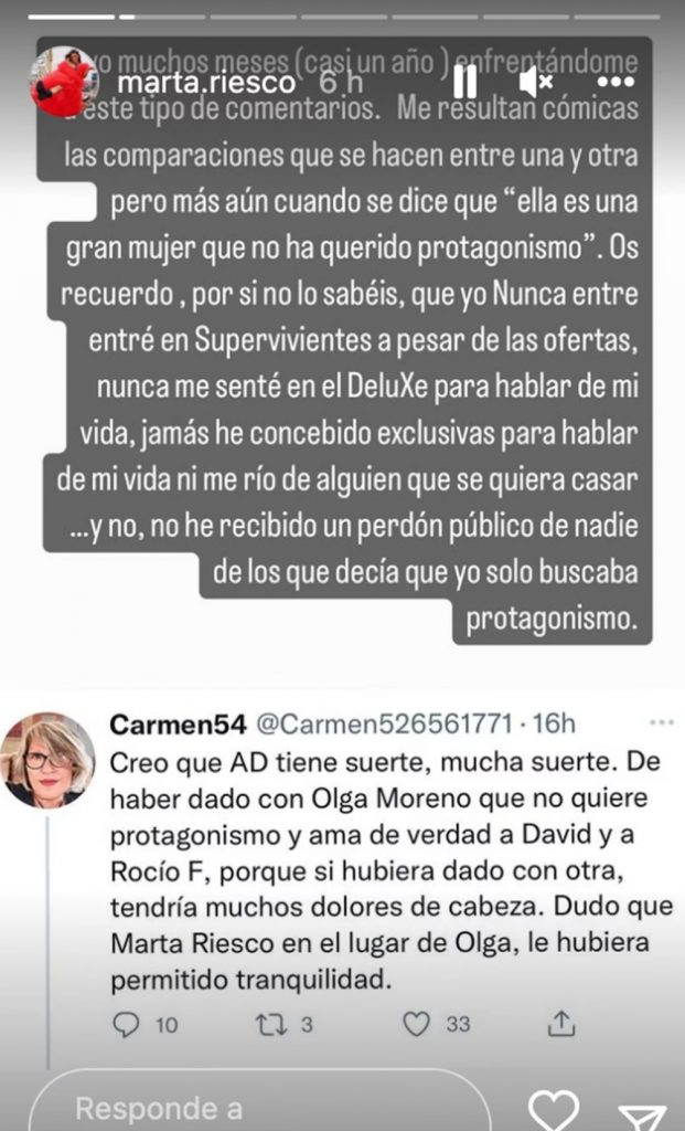 En esta última ocasión, la reportera de Ya es verano ha querido hacer público uno de los muchos mensajes que encuentra cada vez que entra a Twitter y en los que se le ataca directamente. Unas palabras a las que la propia Marta ha reaccionado con total rotundidad: “Llevo muchos meses (casi un año) enfrentándome a este tipo de comentarios. Me resultan cómicas las comparaciones que se hacen entre una y otra, pero más aún cuando se dice que ‘ella es una gran mujer que no ha querido protagonismo’. Os recuerdo, por si no lo sabéis, que yo nunca entré en Supervivientes a pesar de las ofertas, nunca me senté en el Deluxe para hablar de mi vida, jamás he concebido exclusivas para hablar de mi vida ni me río de alguien que se quiera casar… Y no, no he recibido un perdón público de nadie de los que decían que yo solo buscaba protagonismo”, ha comenzado explicando, dejando entrever que está cansada de que se le acuse de que su amor por el exguardia civil no es del todo real.