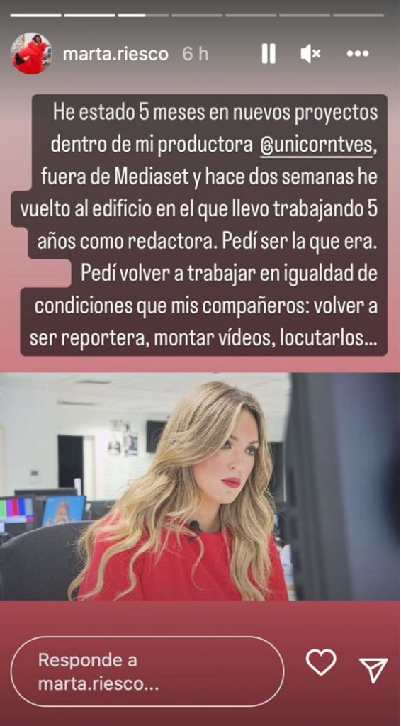 Por si fuera poco, la comunicadora también se ha referido al ámbito profesional a la hora de admitir que, después de haberse alejado de la polémica, ha podido volver a las instalaciones de Mediaset para continuar con sus quehaceres profesionales: “He estado 5 meses en nuevos proyectos dentro de mi productora @unicorntves, fuera de Mediaset, y hace dos semanas he vuelto al edificio en el que llevo trabajando 5 años como redactora. Pedí ser la que era. Pedí volver a trabajar en igualdad de condiciones que mis compañeros: volver a ser reportera, montar vídeos, locutarlos…”, contaba.