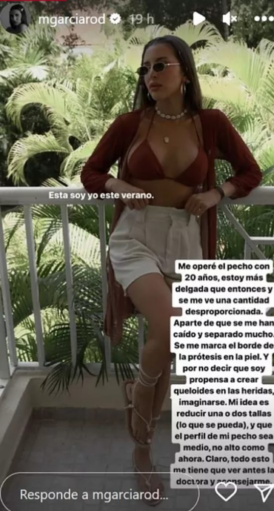 Pero parece que no es la única operación de la que se arrepiente y en Instagram ha revelado que le gustaría reducir el tamaño de su pecho. «Llevo mucho tiempo con la idea de reducirme los pechos. La idea es ponerme mucha menos talla. Me operé con 20 años, ahora estoy más delgada y se me ve una cantidad desproporcionada», explica Marina en la red social.