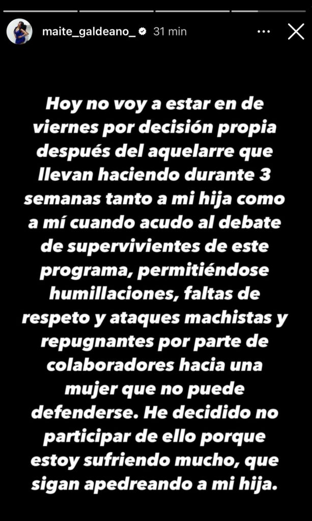 Para Maite Galdeano, en el programa que ha competido contra Tu cara me suena se habrían permitido “humillaciones, faltas de respeto y ataques machistas y repugnantes por parte de colaboradores hacia una mujer que no puede defenderse”. Esa mujer es, evidentemente, Sofía Suescun, su hija, que participa en Supervivientes: All Stars, y que esta semana está en la cuerda floja como nominada junto a Marta Peñate y Lola Mencía.