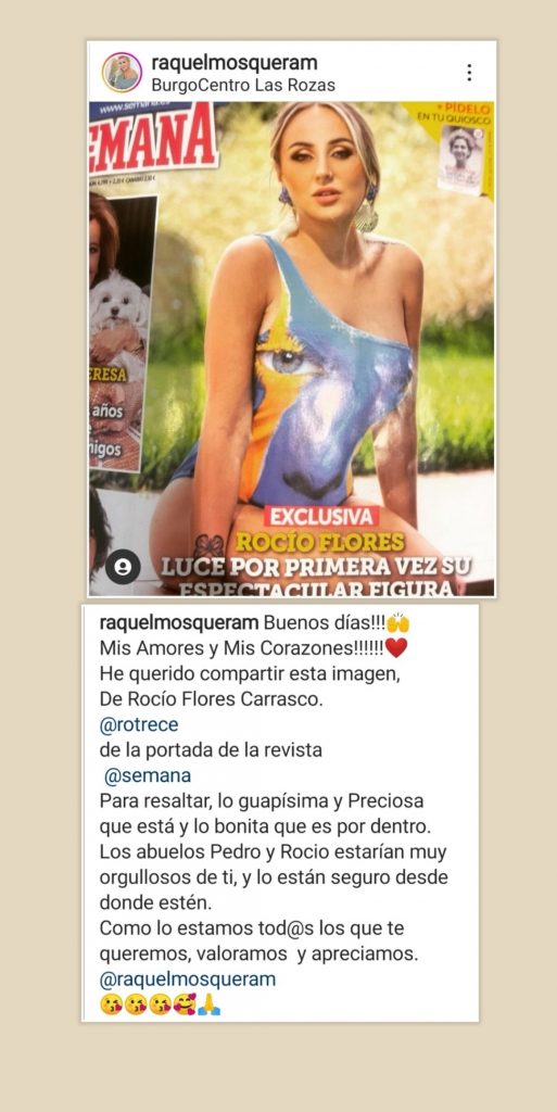 En una de las últimas publicaciones de Rocío Flores, haciendo referencia a una portada en la revista Semana, Raquel Mosquera le escribió un texto en los comentarios alabandola. Parecidos a ese mensaje, Raquel ya lleva unos cuantos desde hace un año, el tiempo que lleva simulando una especie de amistad que no es más que una alianza para hacer frente a Rocío Carrasco. Esto es lo que escribió Raquel Mosquera: