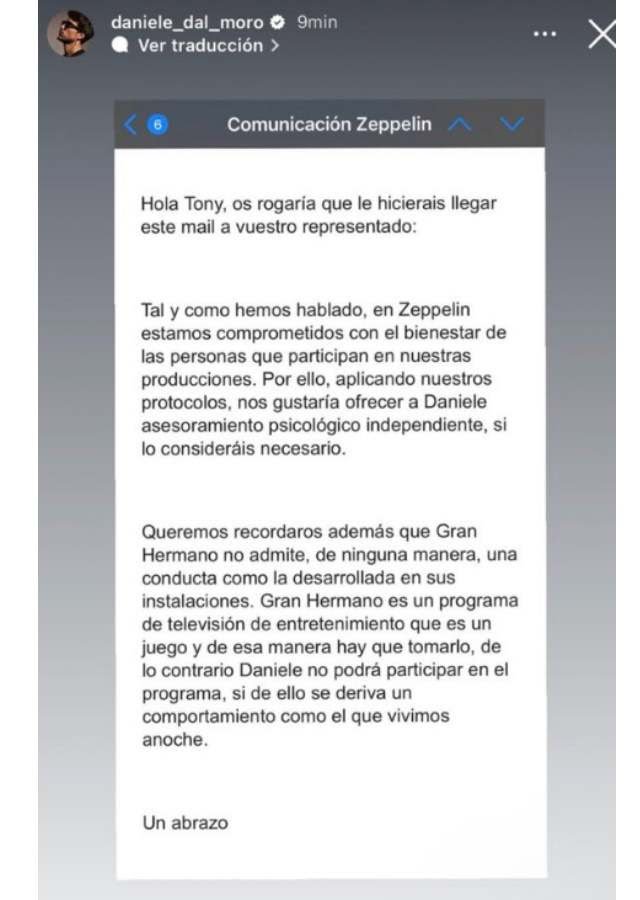 El propio Daniele dal Moro lo ha confirmado en redes sociales, compartiendo además el mensaje que la productora envió a su representante y en el que le ofrecían ayuda psicológica. Este es el mensaje que ha compartido: